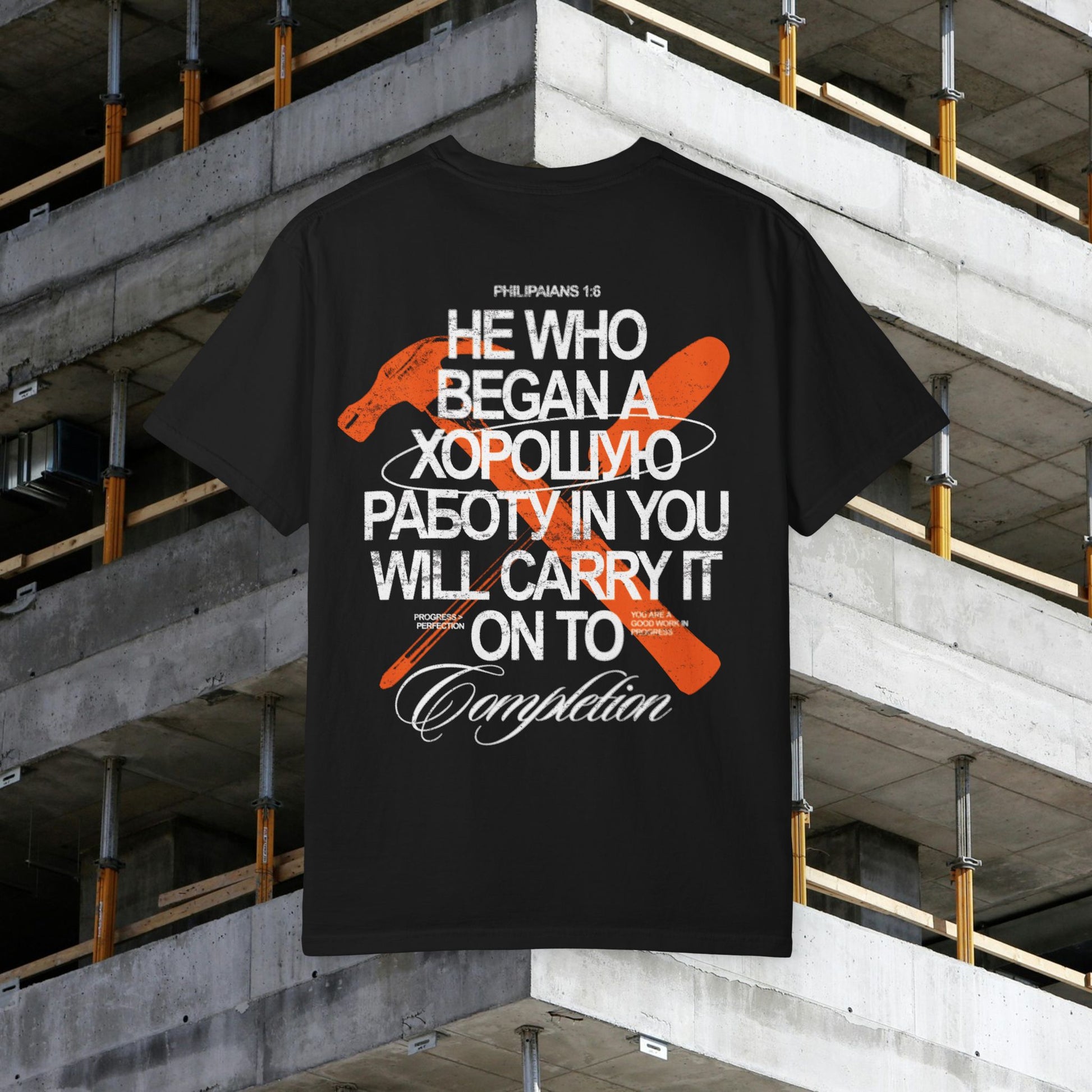 This tee is built on Philippians 1:6 — the reminder that whatever God started in you, He’s going to finish. The mix of English and Russian pulls straight from the verse, with “хорошую работу” meaning “a good work.”